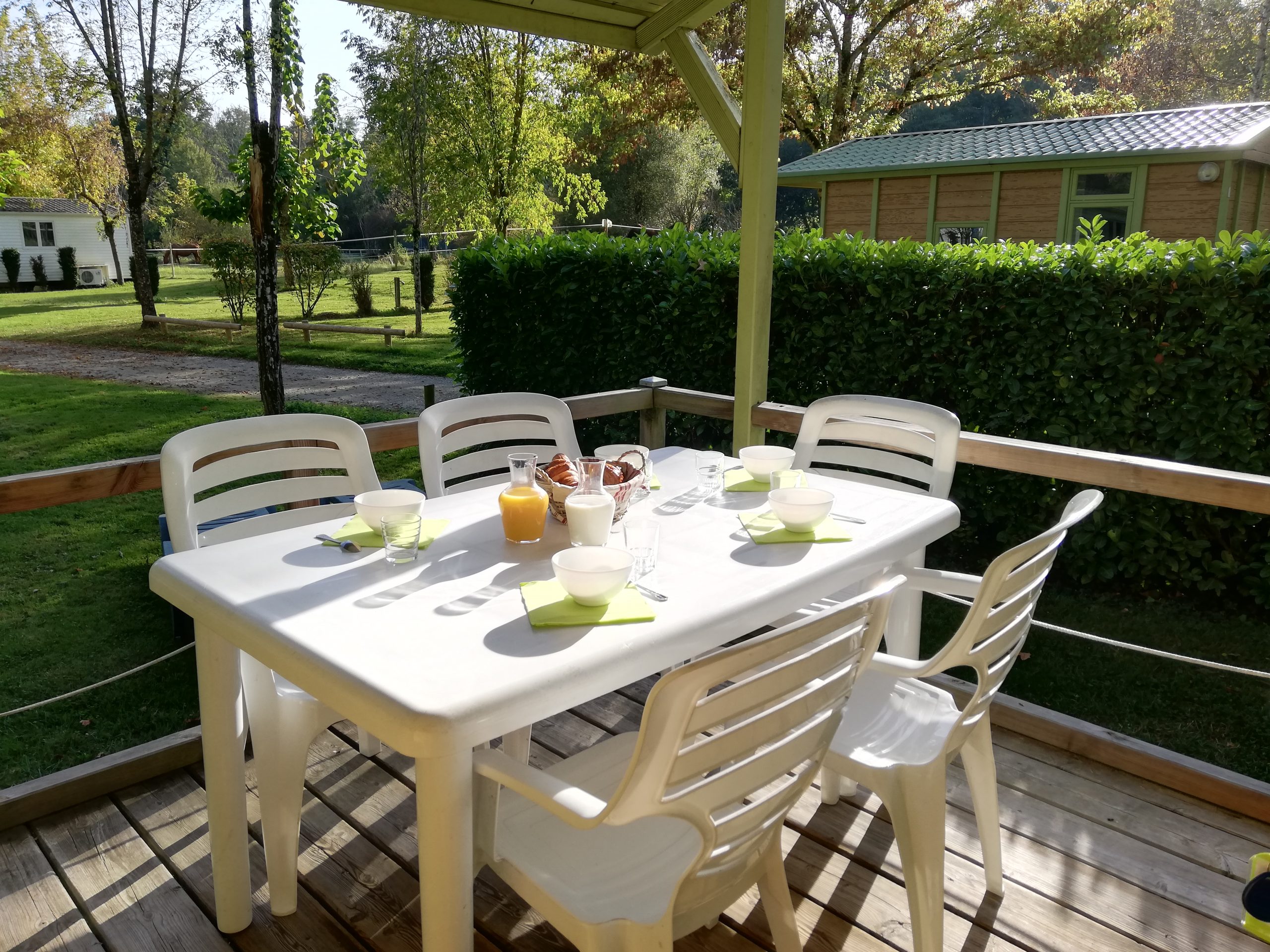 À l’extérieur, une belle terrasse en bois vous attend. Elle est idéale pour se détendre ou savourer un repas en plein air. En outre, ce chalet vous donne accès à toutes les infrastructures du Camping Audinac les Bains, comme la piscine, l’aire de jeux pour enfants et les nombreuses animations.