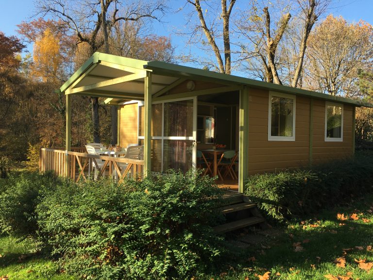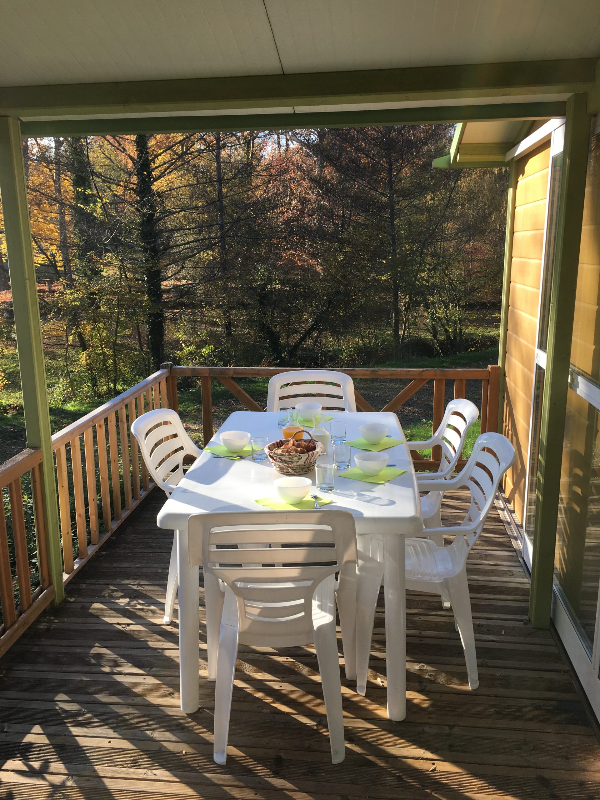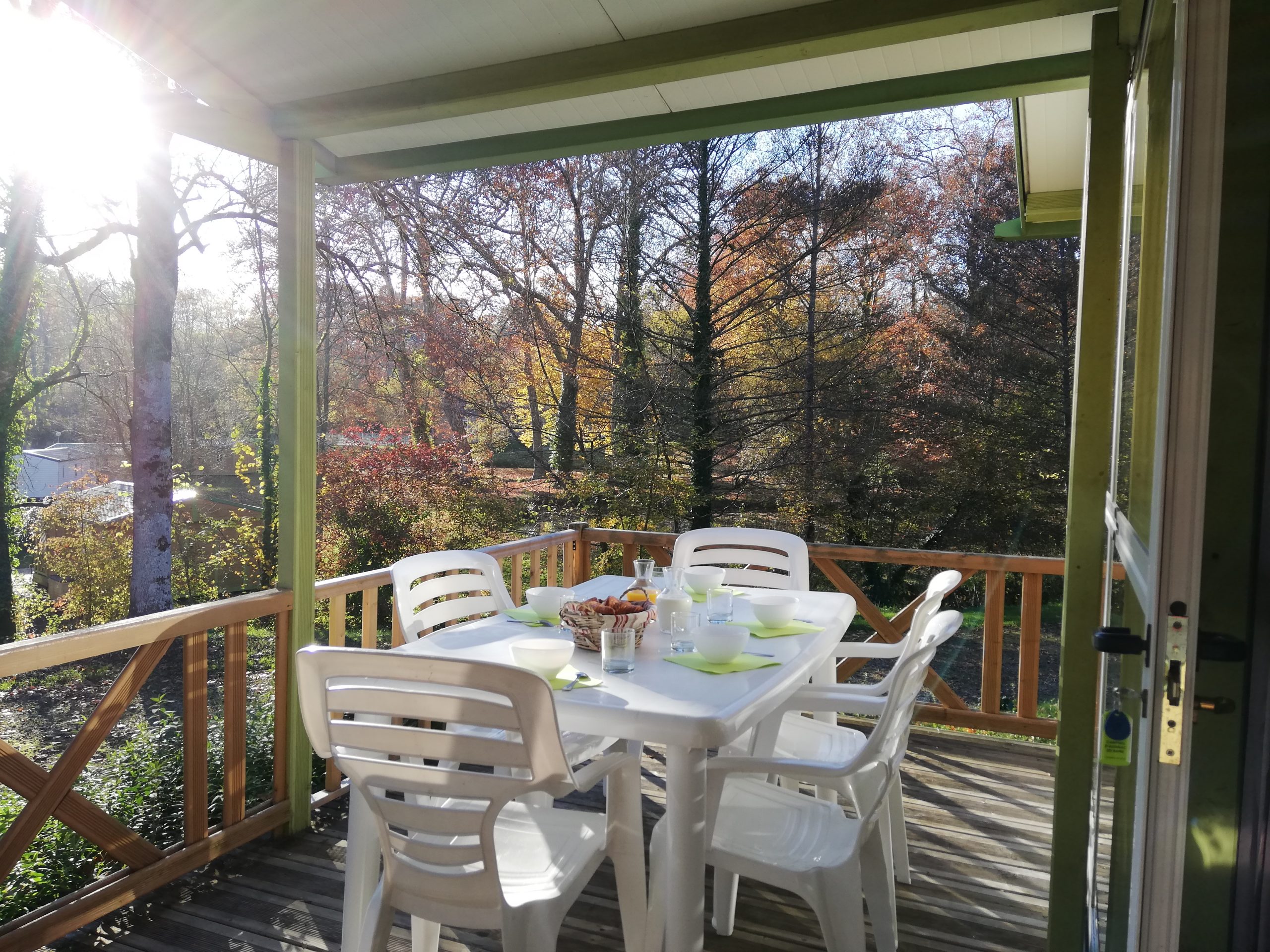Mais le véritable atout de ce chalet avec terrasse, c’est son espace extérieur. Une terrasse couverte, aménagée avec une table et des chaises, est parfaite pour profiter des repas ou simplement admirer la beauté naturelle qui entoure le camping.