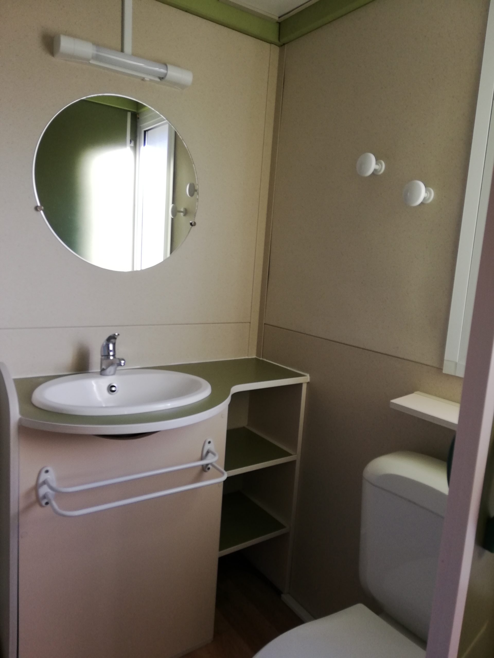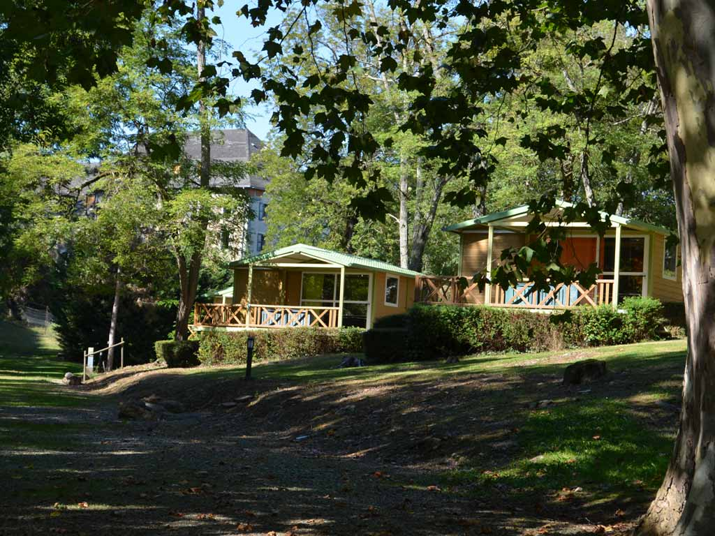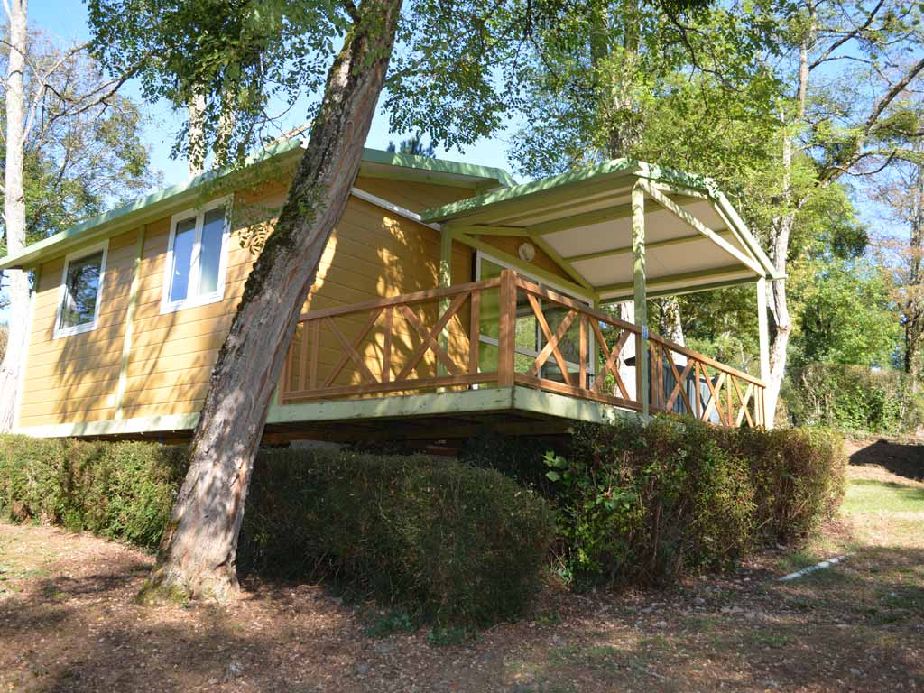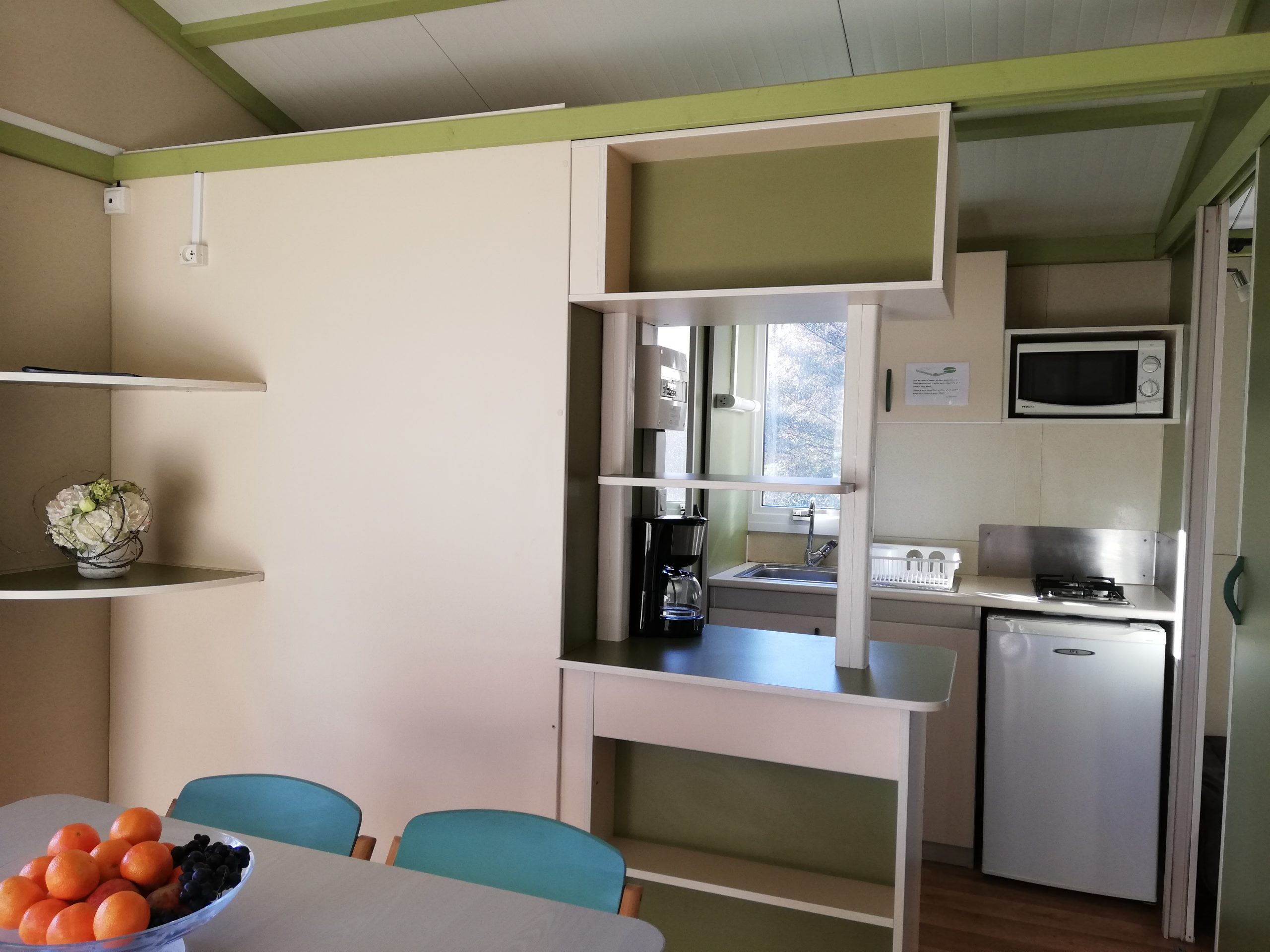 Mais le véritable atout de ce chalet avec terrasse, c’est son espace extérieur. Une terrasse couverte, aménagée avec une table et des chaises, est parfaite pour profiter des repas ou simplement admirer la beauté naturelle qui entoure le camping.