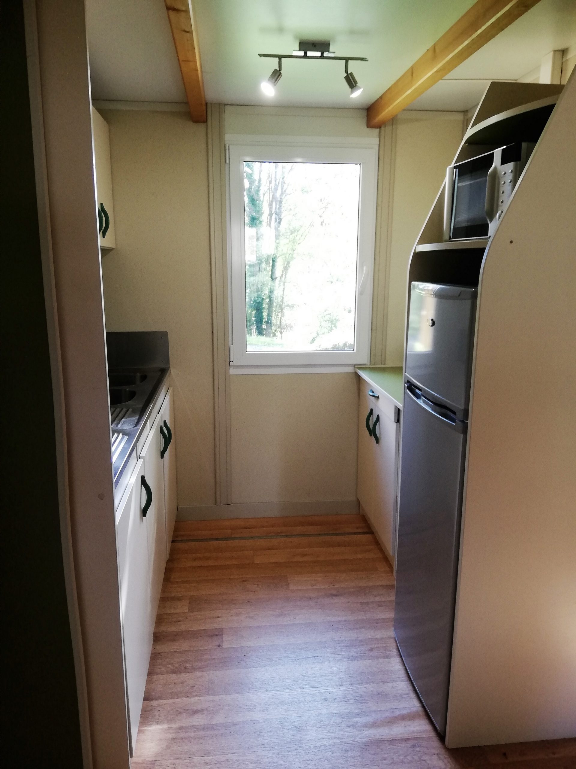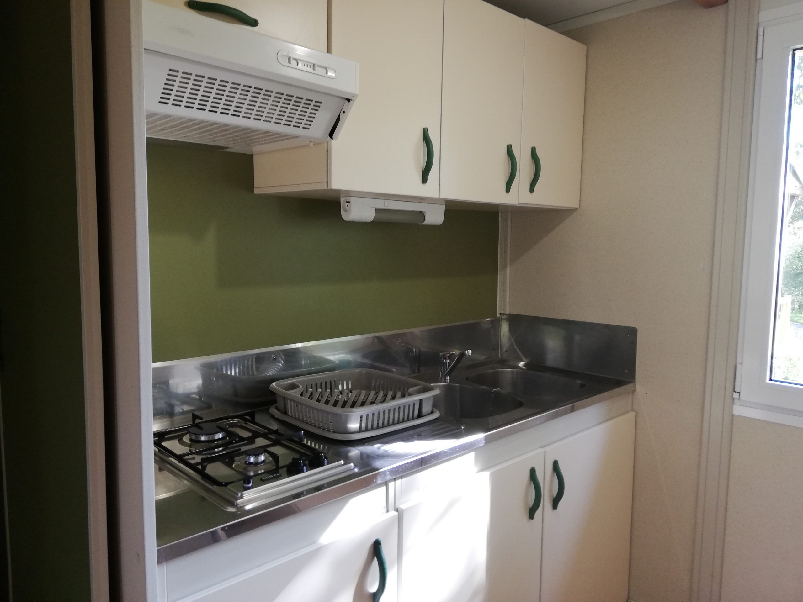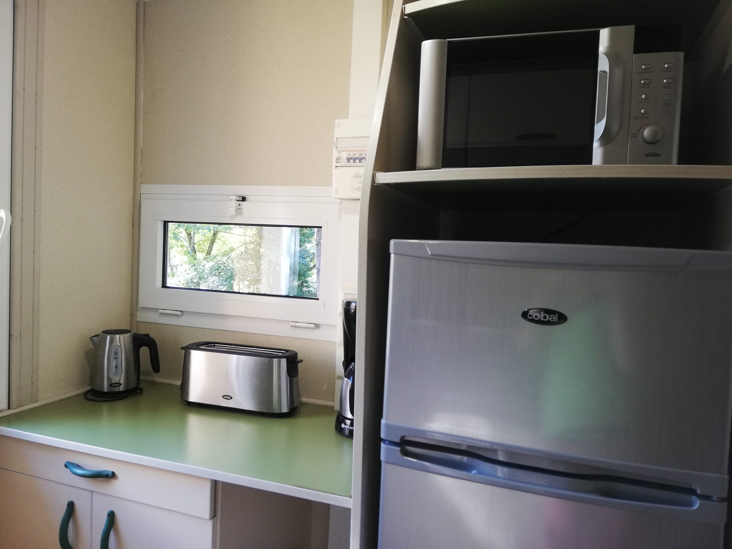 Cuisine séparée avec grand frigo, 2 feux gaz, micro-ondes, cafetière,