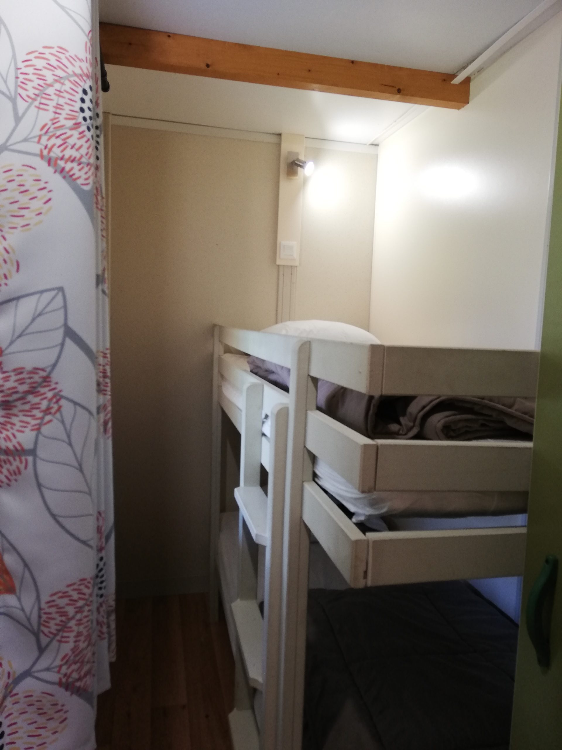 Ce chalet spacieux et confortable de 35 m² est parfait pour les familles, grâce à ses 3 chambres, dont une spécialement pensée pour les enfants avec ses lits superposés . Son grand espace de vie, équipé d’une TV, et sa cuisine séparée en font un lieu chaleureux et pratique pour vos vacances. La terrasse couverte vous invite à profiter pleinement de l’extérieur, en toute saison.